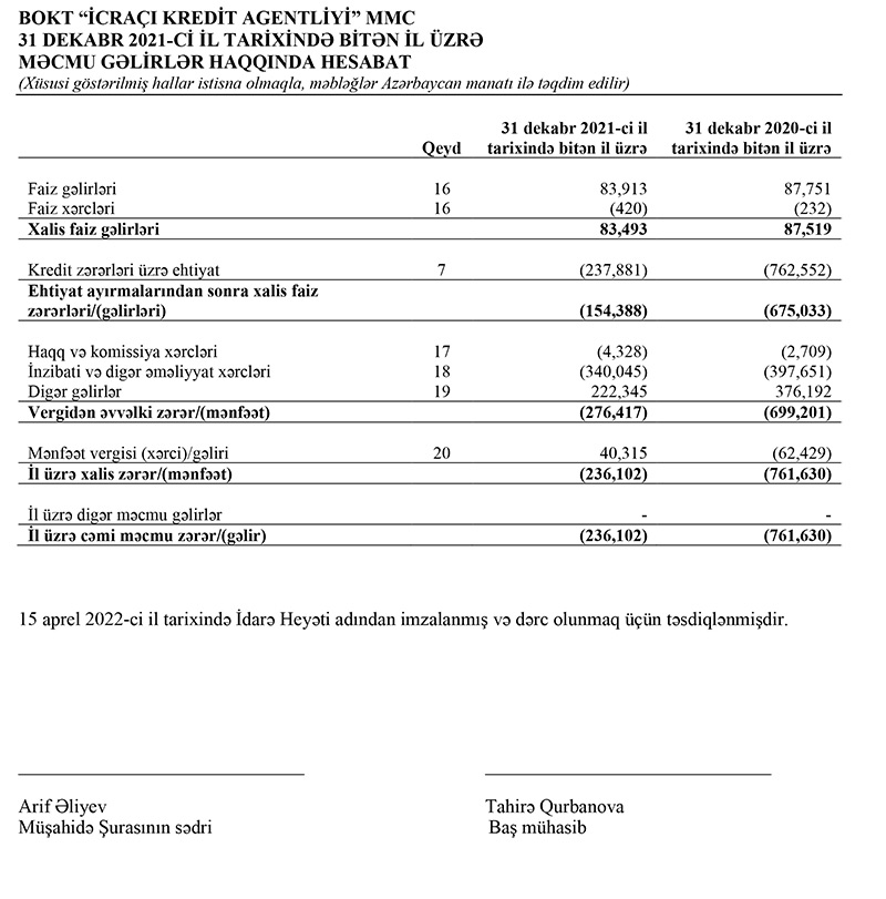 Xalis zərər kredit itkiləri üzrə ehtiyata ayırma ilə əlaqədardır. 2020-ci ildə ehtiyata 762 min 552 manat, 2021-ci ildə isə 237 min 881 manat ayrılıb.