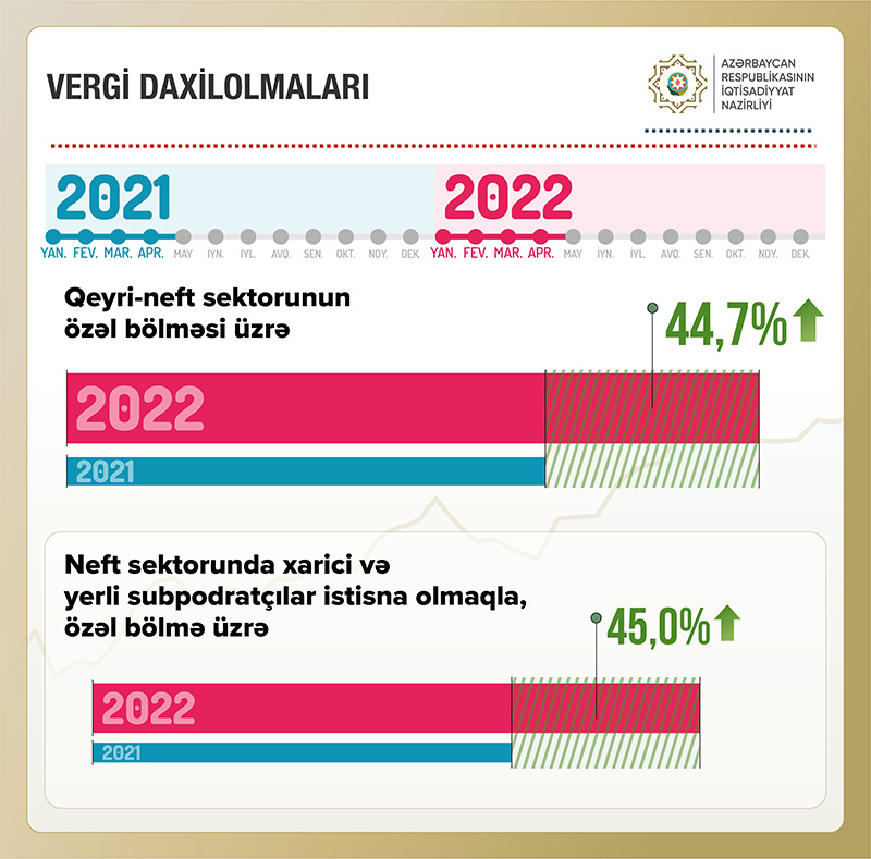 2022-ci ilin yanvar-aprel aylarında qeyri-neft sektorunun özəl bölməsi üzrə vergi daxilolmaları ötən ilin müvafiq dövrü ilə müqayisədə 44,7%, neft sektorunda xarici və yerli subpodratçıların vergiləri istisna olmaqla, özəl sektordan daxilolmalar 45% artıb.