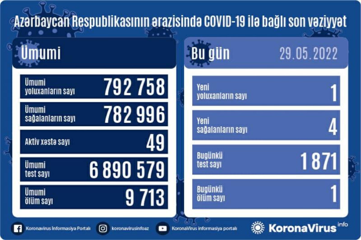 Azərbaycan Respublikasında koronavirus (COVID-19) infeksiyasına 1 yeni yoluxma faktı qeydə alınıb, 4 nəfər müalicə olunaraq sağalıb.