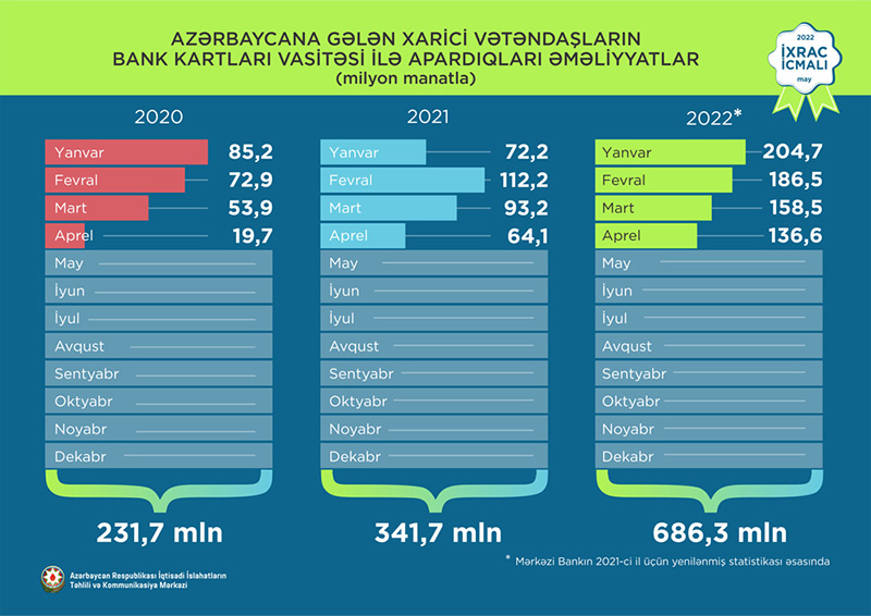 2022-ci ilin yanvar-aprel aylarında isə əcnəbilər bank kartları vasitəsi ilə 686,3 milyon manatlıq əməliyyat aparıblar.