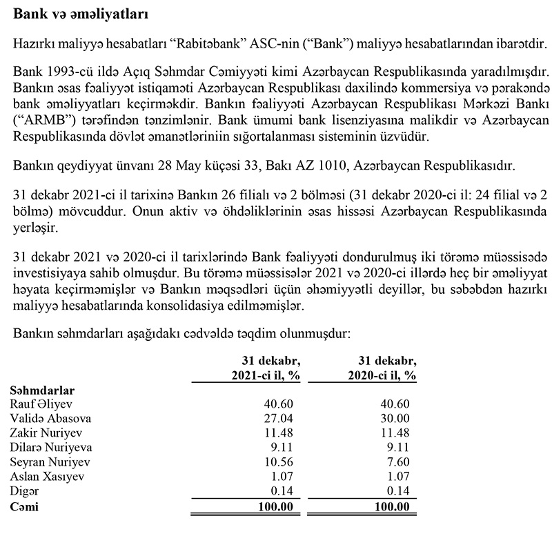 Sənədə əsasən, "Rabitəbank"ın səhmlərinin 30%-nə nəzarət edən Validə Abbasova payını 27,04%-ə endirib, əvəzində Bankın səhmlərinin 7,6%-nə nəzarət edən Seyran Nuriyev payını 10,56%-ə çatdırıb.