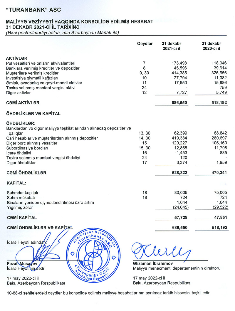 “Turanbank”ın auditi aparılıb, maliyyə vəziyyətinə qiymət verilib.“Turanbank” ASC 31 dekabr 2021-ci il tarixində başa çatmış il üzrə Beynəlxalq Maliyyə Hesabatları Standartlarına uyğun Hazırlanmış Konsolidə edilmiş Maliyyə Hesabatları və Müstəqil Auditorların Rəyini öz İnternet saytında yerləşdirib.