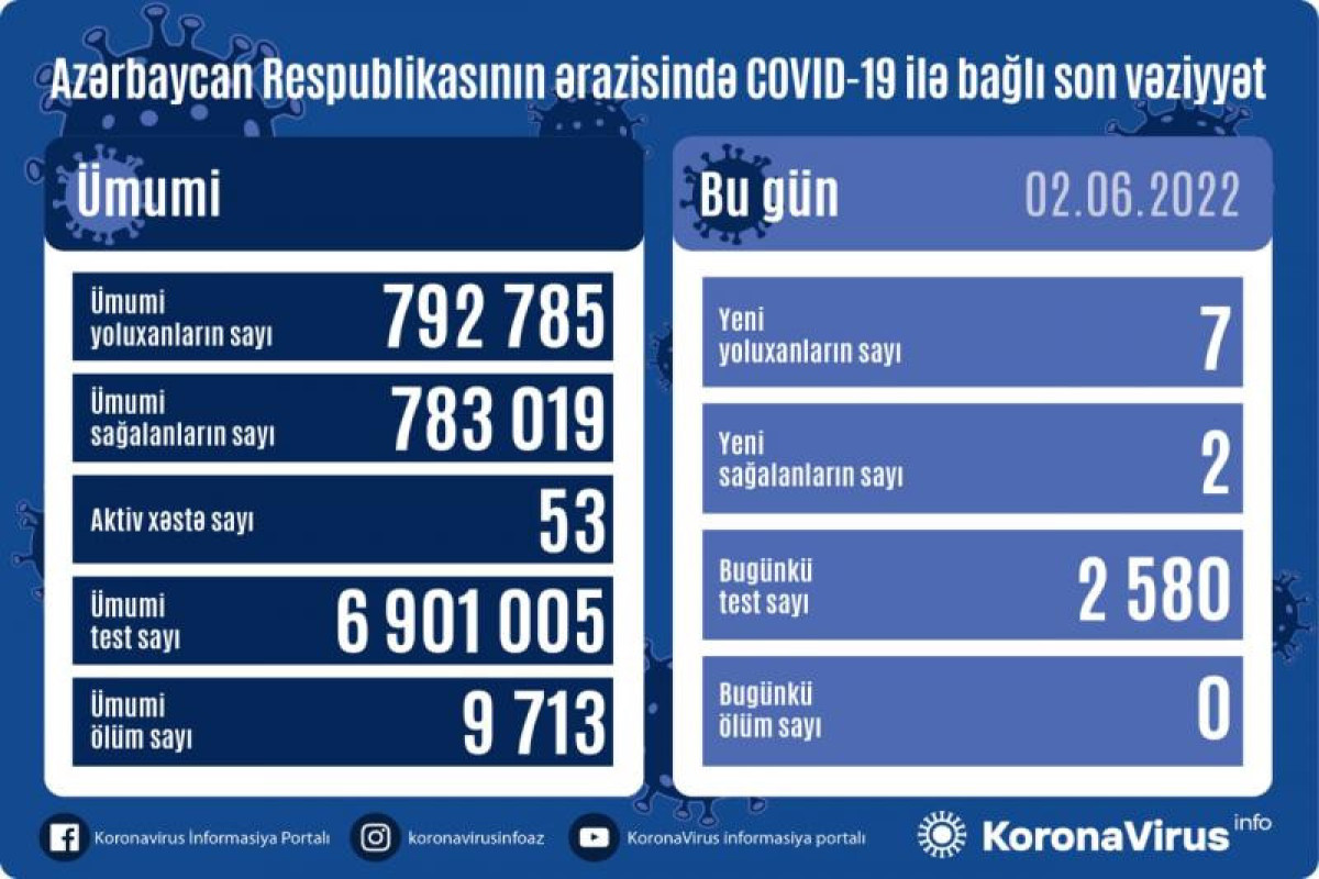 Azərbaycan Respublikasında koronavirus (COVID-19) infeksiyasına 7 yeni yoluxma faktı qeydə alınıb, 2 nəfər müalicə olunaraq sağalıb.