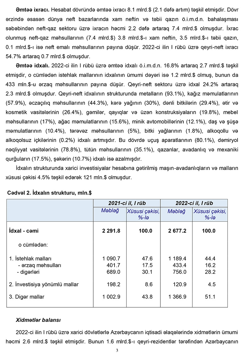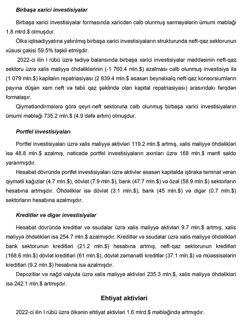 Mərkəzi Bank qeyd edib ki, 2022-ci ilin 1-ci rübündə tədiyə balansı əsasən qlobal əmtəə bazarlarında neft-qaz qiymətlərinin və qeyri-neft ixracının əhəmiyyətli artımından təsirlənmişdir. Cari əməliyyatlar balansında 4 milyard dollar profisit, kapital və maliyyənin hərəkəti hesabında isə 1.2 milyard dollar kəsir yaranmış, ehtiyat aktivləri təxminən 1.6 milyard dollar artmışdır.