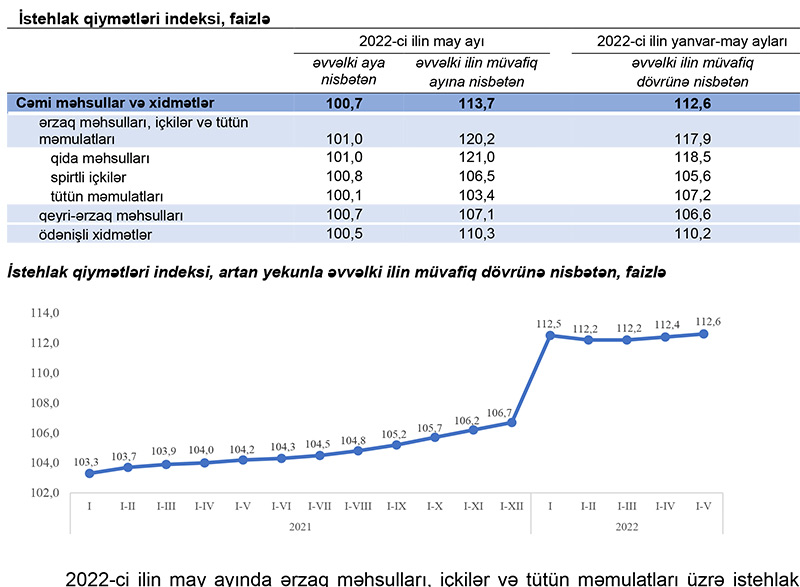 Ərzaq məhsulları, içkilər və tütün məmulatları qiymətlər 20 faizdən çox artıb.2022-ci ilin yanvar-may aylarında istehlak qiymətləri indeksi (inflyasiya göstəricisi) 2021-ci ilin yanvar-may aylarına nisbətən 12,6 faiz, o cümlədən ərzaq məhsulları, içkilər və tütün məmulatları üzrə 17,9 faiz, qeyri-ərzaq məhsulları üzrə 6,6 faiz, əhaliyə göstərilmiş ödənişli xidmətlər üzrə 10,2 faiz artıb.