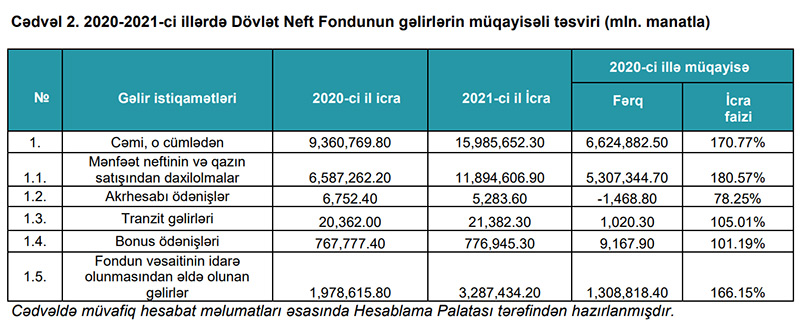 Qeyd edilib ki, 2021-ci ilin 1 yanvar tarixinə Dövlət Neft Fondunun vəsaiti 73 milyard 488,7 milyon manat və ya 43 milyard 564,3 milyon dollar təşkil etmişdir. 2021-ci il ərzində manat ifadəsilə Dövlət Neft Fondunun büdcə gəlirlərinin ümumi həcmi 15 milyard 985,7 milyon manat təşkil etməklə, büdcədə nəzərdə tutulana nisbətən (8 milyard 001,2 milyon manat) 199,8 faiz səviyyəsində icra edilmişdir. 2021-ci il ərzində Dövlət Neft Fondunun büdcə xərcləri 11 milyard 382,7 milyon manat təşkil etməklə, büdcədə nəzərdə tutulana nisbətən (12 milyard 249,4 milyon manat) 92,9 faiz səviyyəsində icra olunmuşdur.