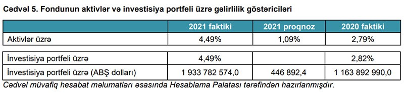 Fondun investisiya portfelinin orta illik gəlirlilik göstəricisi isə 4,49% təşkil etmişdir ki, bu da büdcədə nəzərdə tutulmuş gəlirlilik göstəricisi ilə müqayisədə (1,09%) 4,2 dəfə, 2020-ci il ilə müqayisədə 1,6 dəfə çoxdur.