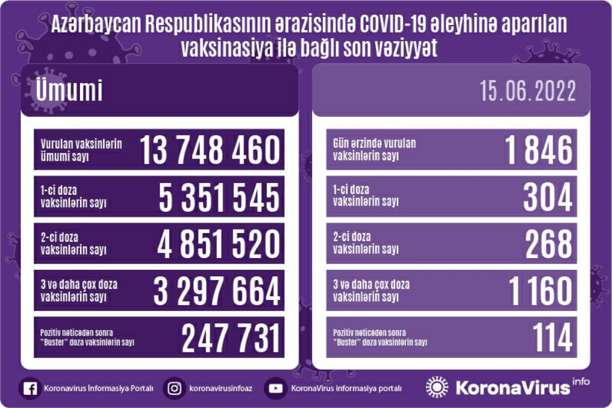 Azərbaycanda son sutkada koronavirus (COVID-19) əleyhinə 1846 vaksin vurulub. Bir gündə birinci mərhələ üzrə vaksinasiya olunanların sayı 304, ikinci mərhələ üzrə vaksinasiya olunanların sayı 268, üç və daha çox doza vaksin vurduranların sayı 1160, pozitiv nəticədən sonra buster doza üzrə vaksinasiya olunanların sayı isə 114 nəfərdir.