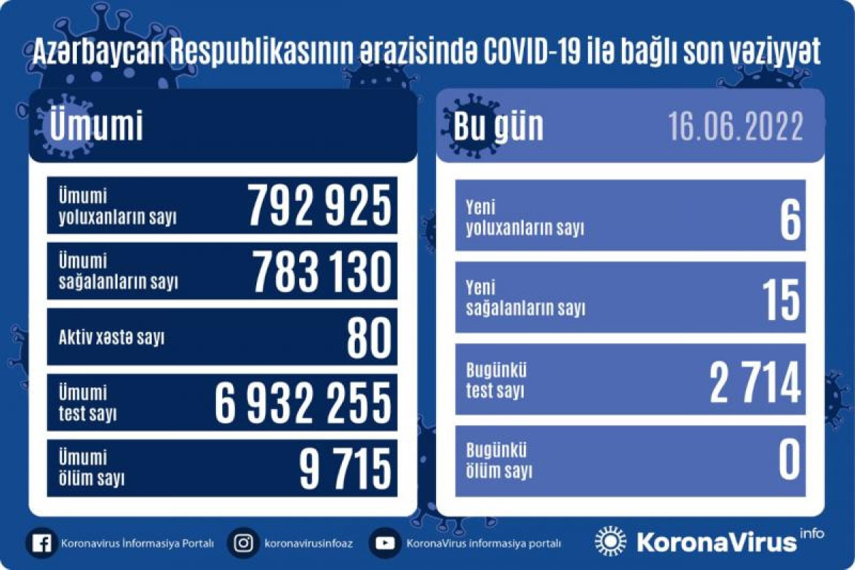 Azərbaycanda koronavirus (COVID-19) infeksiyasına 6 yeni yoluxma faktı qeydə alınıb, 15 nəfər müalicə olunaraq sağalıb.