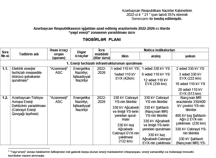 Azad edilmiş ərazilərdə “yaşıl enerji” zonasının yaradılması üzrə Tədbirlər Planı təsdiqləndi - CƏDVƏL