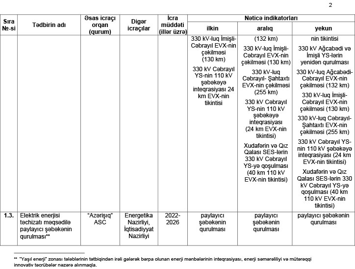 Həmin tədbirlər elektrik enerjisi və qaz təchizatı məqsədilə nəql və paylayıcı şəbəkələrin qurulmasını, Naxçıvandan keçməklə Azərbaycan-Türkiyə-Avropa Enerji Dəhlizinin yaradılmasını, bərpa olunan enerji mənbələrinin potensialının ölçülməsini, Xudafərin və Qız Qalası su elektrik stansiyalarının, habelə Cəbrayıl rayonunda günəş, Laçın-Kəlbəcər rayonlarında külək elektrik stansiyalarının tikintisini, yaşıl texnologiyaların tətbiqi istiqamətində damüstü günəş enerjisistemlərinin quraşdırılmasını, küçə və yolların işıqlandırılmasında enerji səmərəli yaşıl texnologiyalarının tətbiqini, nəqliyyat vasitələri üçün elektrik doldurma məntəqələrinin quraşdırılmasını və s. əhatə edir.