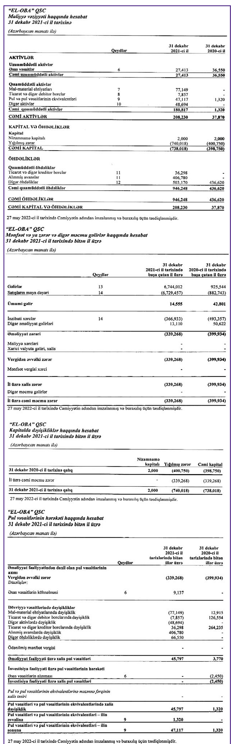 "El-Oba" QSC 2021-ci il 339 min manat xalis zərər ilə yekunlaşdırıb. 2020-ci ildə şirkətin xalis zərəri 400 min manat təşkil etmişdi. 2020-ci illə müqayisədə 2021-ci ildə "El-Oba" QSC-nin satışdan gəlirləri 7 dəfədən çox artaraq 6 milyon 744 min manat təşkil edib. Şirkət 2020-ci ildə 925 min manat gəlir əldə etmişdi.