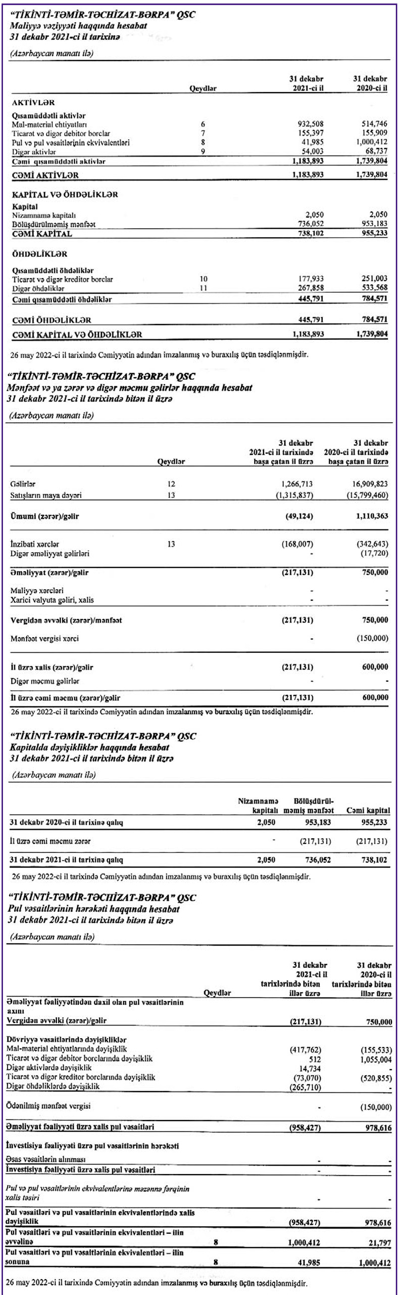 "Tikinti-Təmir-Təchizat-Bərpa" QSC 2021-ci ili 217 min manat xalis zərər ilə başa vurub. Şirkət 2020-ci ili 600 min manat xalis mənfəət ilə bağlamışdı.