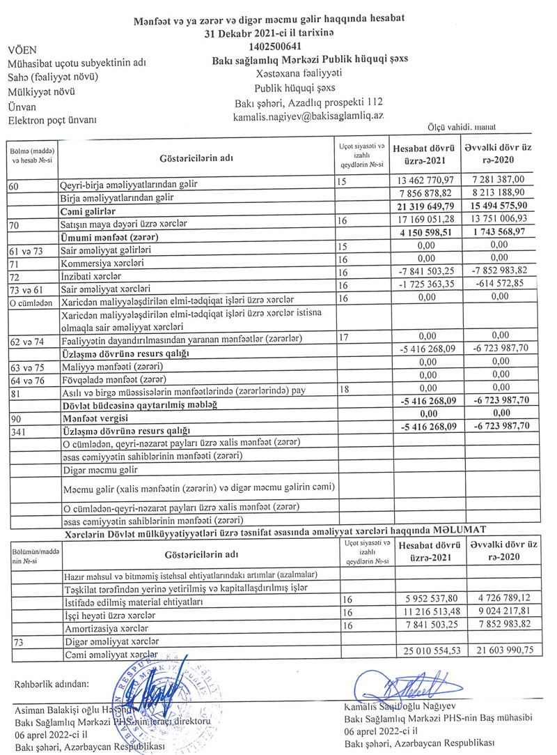 Bakı Sağlamlıq Mərkəzi publik hüquqi şəxs 2021-ci ili 5 milyon 416 min manat xalis zərər ilə başa vurub və təşkilatın yığılmış zərəri 25 milyon 100 min manata çatıb.