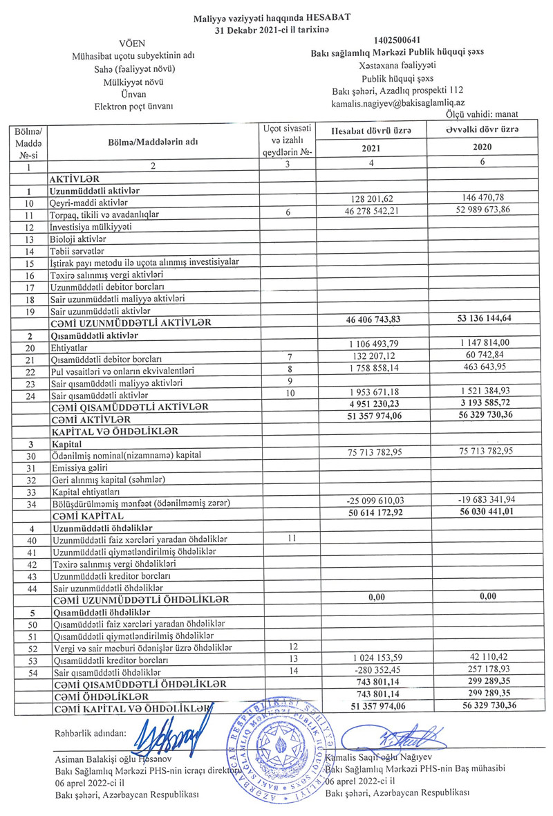 31 dekabr 2021-ci il tarixində Bakı Sağlamlıq Mərkəzi 51 milyon 358 min manat cəmi aktivlərə və 50 milyon 614 min manat cəmi kapitala malik olub. Yığılmış zərərə görə Mərkəzin nizamnamə kapitalı 75 milyon 714 min manatdan 50 milyon 614 min manata düşüb.