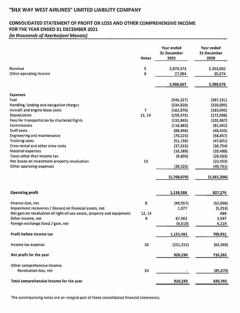 Hava nəqliyyatı ilə yüklərin daşınması ilə məşğul olan "Silk Vey Vest Aviaşirkəti" MMC 2021-ci ili 920 milyon 230 min manat xalis mənfəət ilə başa vurub. Halbuki, şirkət 2020-ci ili 630 milyon 392 min manat xalis mənfəət ilə bağlamışdı. Beləliklə, "Silk Vey Vest Aviaşirkəti"nin xalis mənfəəti 289 milyon 838 min manat və ya 46% artıb.
