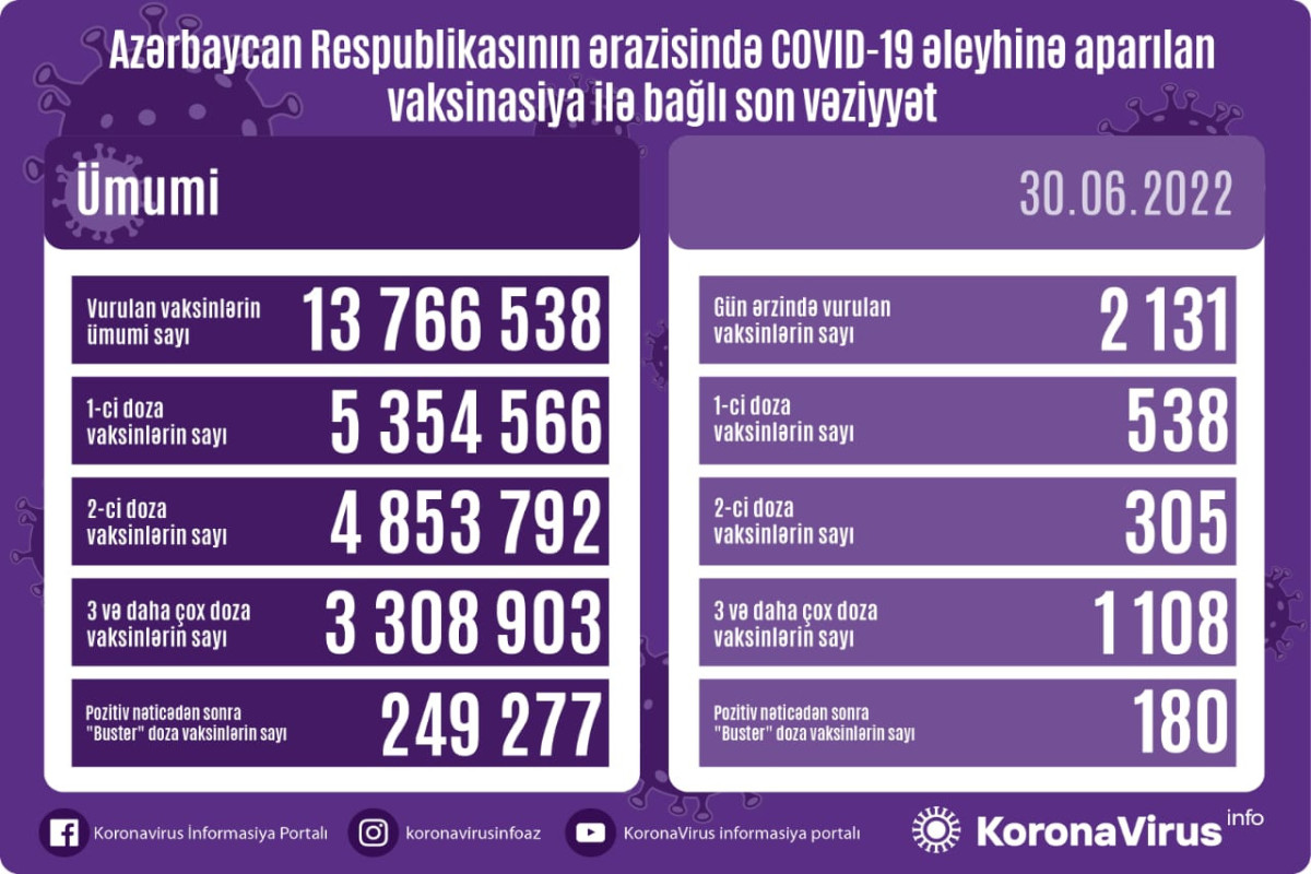 Azərbaycanda son sutkada koronavirus (COVID-19) əleyhinə 2131 vaksin vurulub. Bir gündə birinci mərhələ üzrə vaksinasiya olunanların sayı 538, ikinci mərhələ üzrə vaksinasiya olunanların sayı 305, üç və daha çox doza üzrə vaksinasiya olunanların sayı 1108, pozitiv nəticədən sonra buster doza üzrə vaksinasiya olunanların sayı 180 nəfərdir.