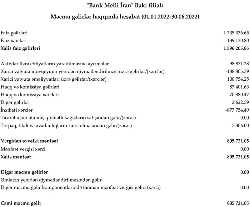 "Bank Melli İran" Bakı filialı 2022-ci ilin ilk 6 ayını (yanvar-iyun dövrünü) 805 min 721 manat xalis mənfəət ilə başa vurub. Filial ötən ilin eyni dövrünü 575 min 159 manat xalis mənfəət ilə bağlamışdı. Beləliklə, 2021-ci ilin ilk 6 ayı ilə müqayisədə 2022-ci ilin ilk 6 ayında "Bank Melli İran" Bakı filialının xalis mənfəəti 40% artıb.
