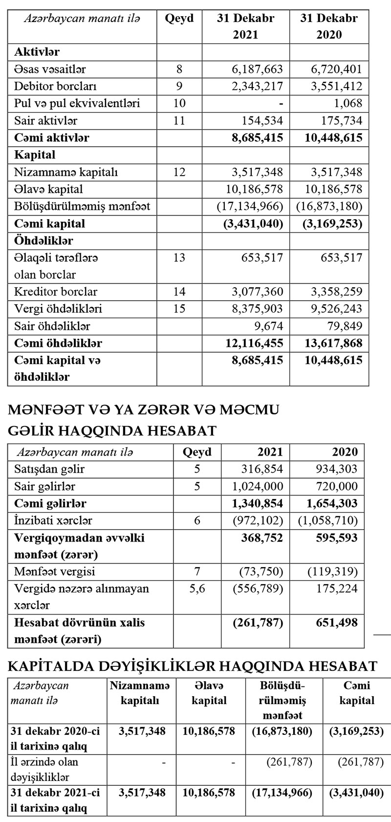 Marja.az Şirkətin maliyyə göstəricilərinə istinadən xəbər verir ki, 2020-ci ildə satışdan gəlirlər 934 min 303 manat ikən, 2021-ci ildə 316 min 854 manata düşüb. Sair gəlirlər isə 720 min manatdan 1 milyon 24 min manata yüksəlib.