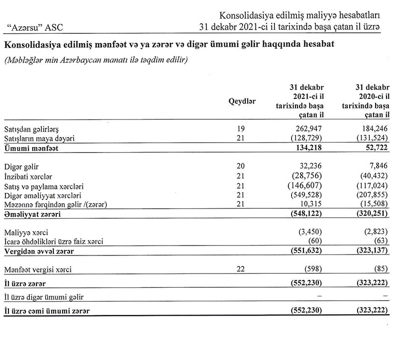"Azərsu" ASC 2021-ci ili 552 milyon 230 min manat xalis zərər ilə başa vurub. Halbuki, dövlət şirkəti 2020-ci ili 323 milyon 222 min manat xalis zərər ilə bağlamışdı. Beləliklə, "Azərsu" ASC-nin xalis zərəri 229 milyon 8 min manat və ya 70,8% artıb.