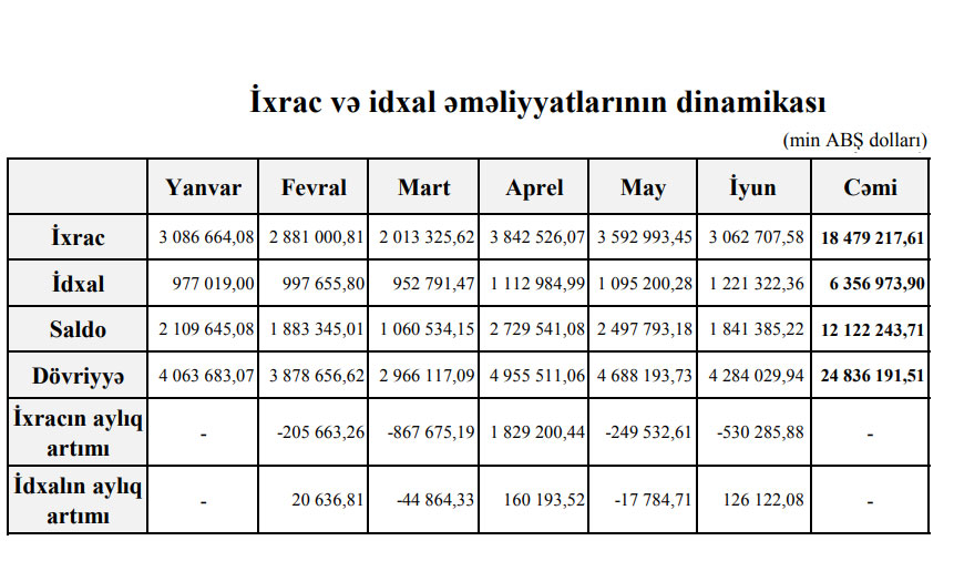 2022-ci ilin 1-ci yarısında (yanvar-iyun) Azərbaycanın ixracı 18 milyard 479 milyon dollar, idxalı 6 milyard 357 milyon dollar, müsbət saldo isə 12 milyard 122 milyon dollar təşkil edib.2022-ci ilin 1-ci yarısında (yanvar-iyun dövründə) Azərbaycanın xarici ticarət əməliyyatlarının həcmi 24 milyard 836 milyon 191 min ABŞ dolları təşkil edib.