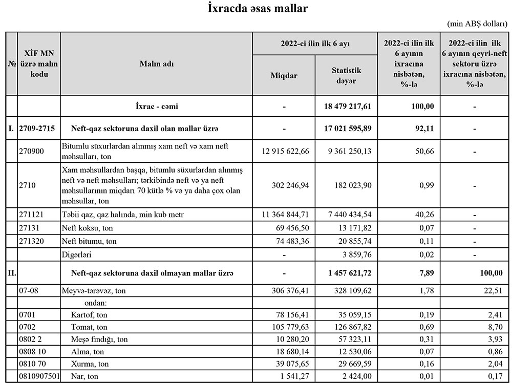 2022-ci ilin 1-ci yarısında (yanvar-iyun dövründə) Azərbaycanın 18 milyard 479 milyon dollarlıq ixracın 17 milyard 22 milyon dolları və ya 92,11%-i neft-qaz sektoruna daxil olan mallar üzrə olub.