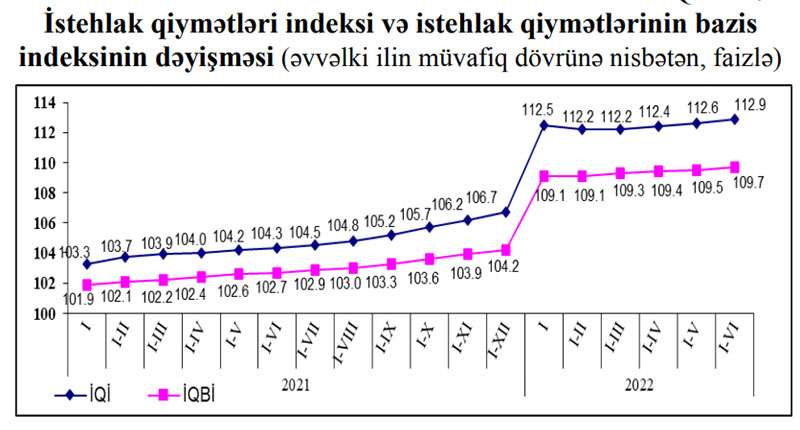 Qiymətləri dövlət tərəfindən tənzimlənən məhsullar və xidmətlər, həmçinin mövsümi xarakter daşıyan kənd təsərrüfatı məhsulları nəzərə alınmadan hesablanan və bazis inflyasiyası kimi qəbul edilmiş istehlak qiymətlərinin bazis indeksi 2022-ci ilin iyun ayında may ayı ilə müqayisədə 0,8 faiz, əvvəlki ilin iyun ayı ilə müqayisədə 10,7 faiz, 2022-ci ilin yanvar-iyun aylarında əvvəlki ilin müvafiq dövrü ilə müqayisədə isə 9,7 faiz artıb.