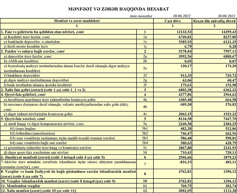 Qeyd edək ki, 2021-ci ilin yanvar-iyun dövründə "Azərbaycan Sənaye Bankı" ASC-nin cəmi əməliyyat gəlirləri 17 milyon 324 min manat, cəmi əməliyyat xərcləri 15 milyon 445 min manat, əməliyyat mənfəəti 1 milyon 879 min manat, aktivlər üzrə mümkün zərərlərin ödənilməsi üçün xüsusi ehtiyata ayırma 483 min manat, ödənilmiş məmfəət vergisi 283 min manat təşkil etmişdi.
