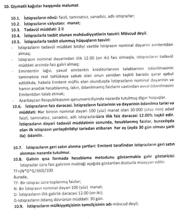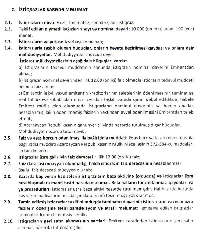 İlk tranşda 10 min ədədlik (1 milyon manatlıq) istiqrazlar yerləşdiriləcəkdir.