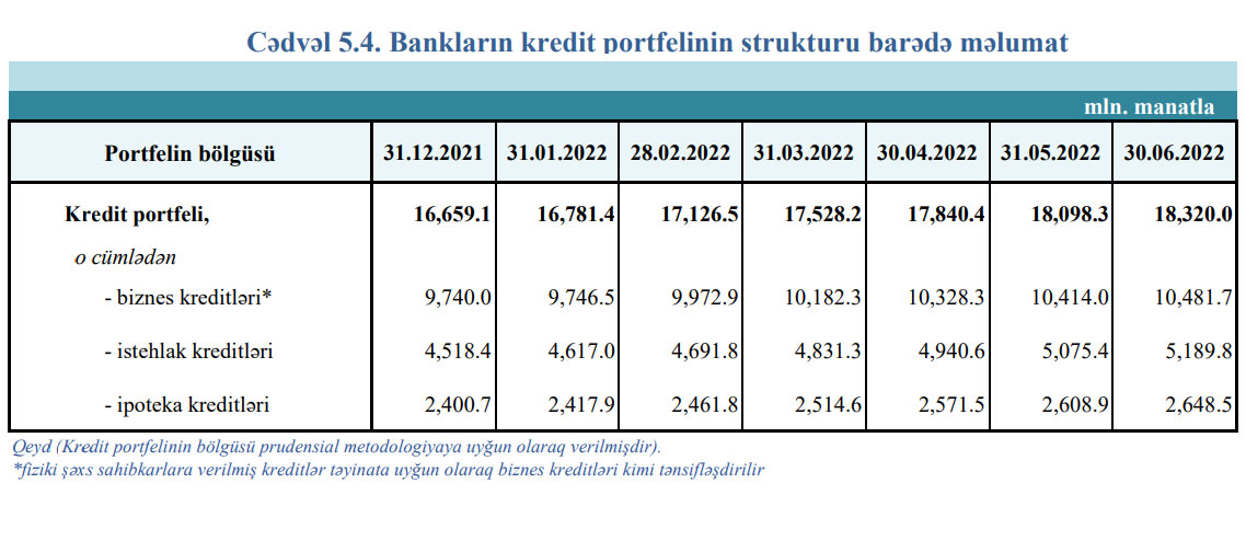 2022-ci ilin may ayı ilə müqayisədə iyun ayında biznes kreditləri 67,7 milyon manat artaraq 10 milyard 481,7 milyon manata, istehlak kreditləri 114,4 milyon manat artaraq 5 milyard 189,8 milyon manata, ipoteka kreditləri isə 39,6 milyon manat artaraq 2 milyard 648,5 milyon manata çatıb.