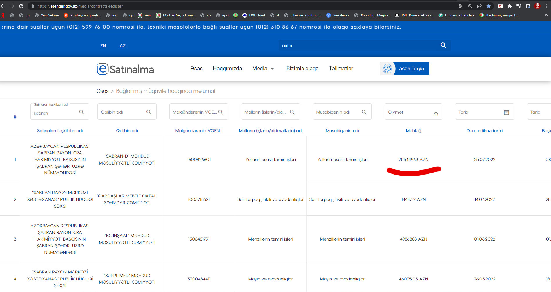 Vahid dövlət elektron satınalmalar portalında verilən məlumata görə, tenderin qalibi "Şabran-D" MMC seçilib və şirkətlə 25,5 milyon manatlıq müqavilə imzalanıb. Müqaviləyə əsasən, 2022-ci ilin sonuna kimi Şabran şəhərində 18 küçədə yollara asvalt döşənilməsi nəzərdə tutulub.