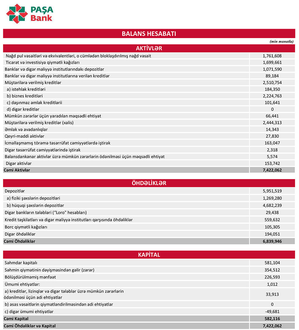 30 İyun 2022-ci il tarixində “PAŞA BAnk” 7 milyard 422 milyon 62 min mant cəmi aktivlərə, o cümlədən 2 milyard 510 milyon 754 min manat kredit portfelinə (müştərilərə verilmiş kreditlər) malik olub. Bank 2021-ci ilin sonunda 6 milyard 408 milyon 381 min manat cəmi aktivlərə, 2 milyard 545 milyon 578 min manat kredit portfeli təşkil etmişdi. Beləliklə, ilk 6 ayda “PAŞA Bank”ın cəmi ativləri 1 milyard 13 milyon 681 min manatartıb, kredit portfeli isə 34 milyon 824 min manat azalıb.
