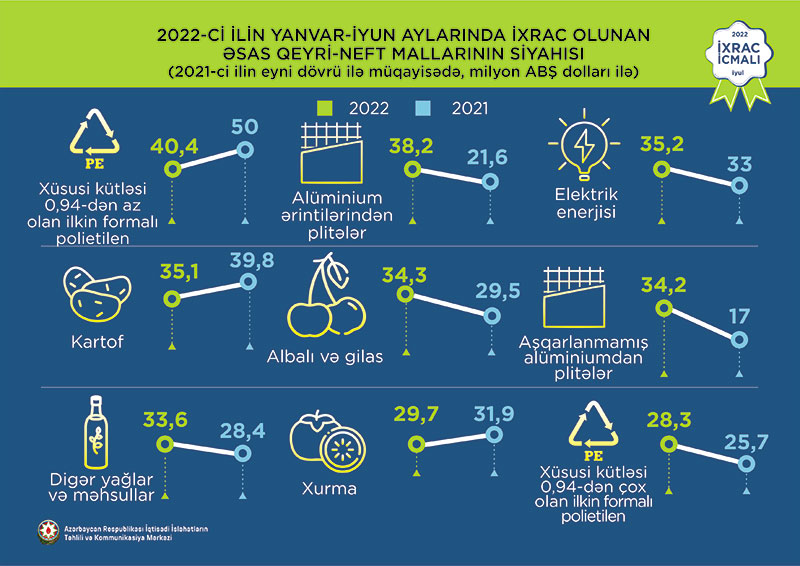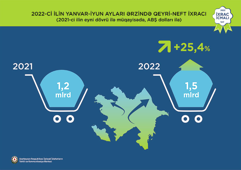 “İxrac icmalı”nın iyul sayına əsasən, 2022-ci ilin yanvar-iyun ayları ərzində Azərbaycanın ixracı 18,5 mlrd. ABŞ dolları, qeyri-neft sektoru üzrə 1,5 mlrd. ABŞ dolları təşkil edib. Qeyri-neft sektoru üzrə ixrac 2021-ci il ilə müqayisədə 295,4 mln. ABŞ dolları və ya 25,4% artıb.