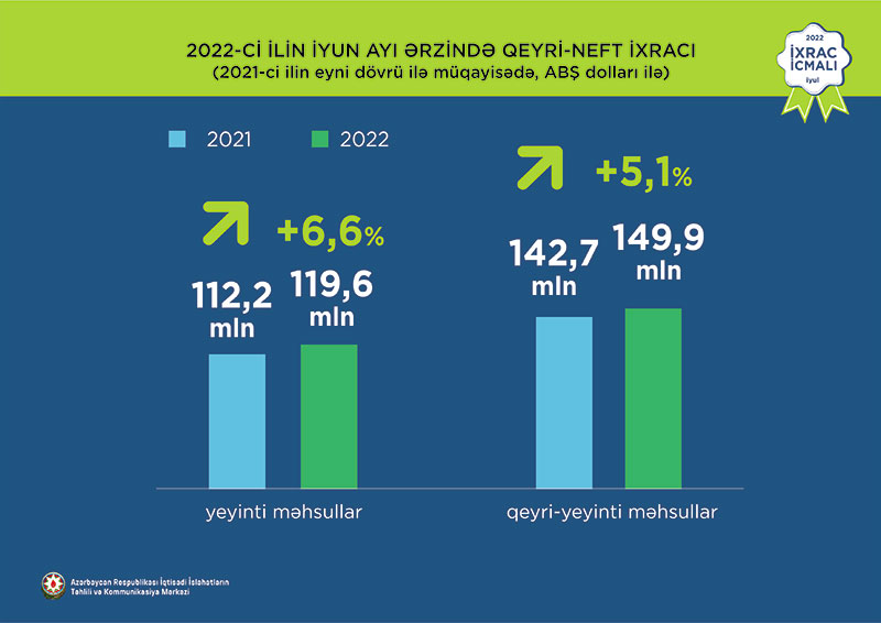 2022-ci ilin iyun ayı üzrə ixrac 3,1 mlrd ABŞ dolları təşkil edib. Qeyri-neft sektoru üzrə ixracda artım 5,8% təşkil etməklə 269,6 mln. ABŞ dolları olub. 2022-ci ilin iyun ayı ərzində yeyinti məhsulları üzrə ixrac 6,6% artaraq 119,6 milyon ABŞ dolları, qeyri-yeyinti məhsulları üzrə isə 5,1% artaraq 149,9 milyon ABŞ dolları təşkil edib.