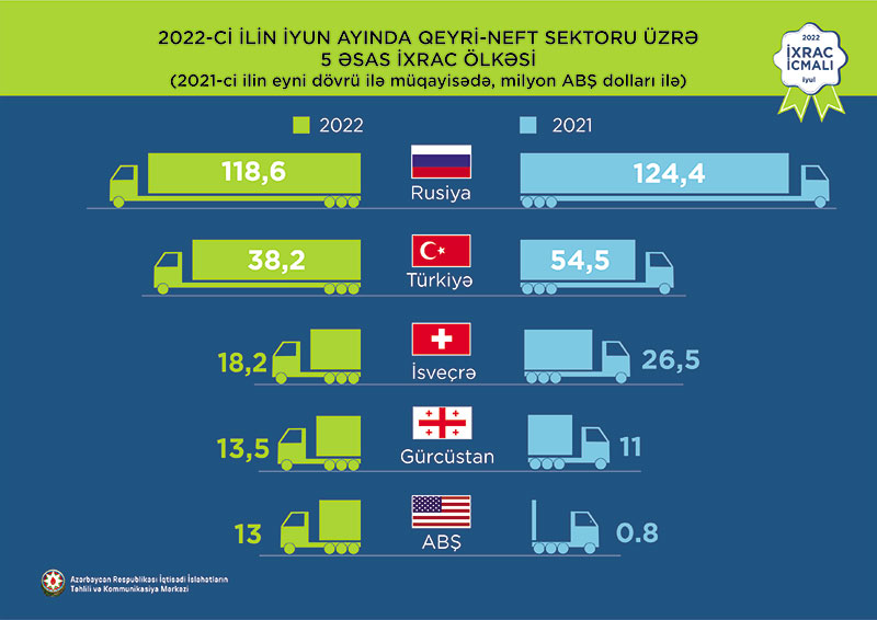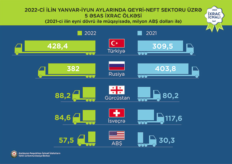 2022-ci ilin yanvar-iyun ayları ərzində Türkiyəyə 428,4 milyon ABŞ dolları, Rusiya Federasiyasına 382 milyon ABŞ dolları, Gürcüstana 88,2 milyon ABŞ dolları, İsveçrə Konfederasiyasına 84,6 milyon ABŞ dolları və ABŞ-a isə 57,5 milyon ABŞ dolları dəyərində qeyri-neft sektoruna aid mal ixrac olunub.