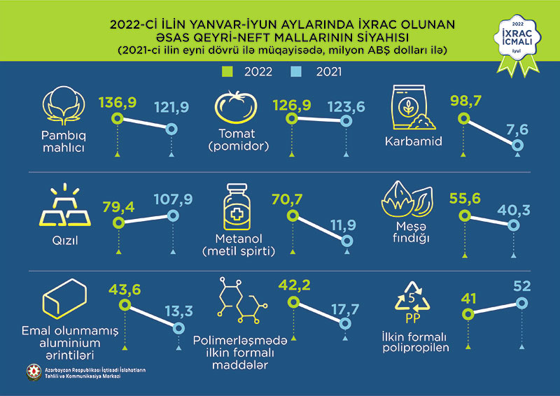 2022-ci ilin yanvar-iyun ayları ərzində ixrac edilən qeyri-neft sektoruna aid malların siyahısında pambıq mahlıcı (136,9 milyon ABŞ dolları) birinci olub. Bu siyahıda tomat (pomidor) (126,9 milyon ABŞ dolları) ikinci, karbamid (98,7 milyon ABŞ dolları) isə üçüncü yerdə qərarlaşıb.