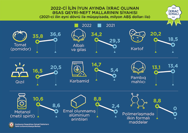 2022-ci ilin iyun ayında ixrac edilən qeyri-neft sektoruna aid malların siyahısında tomat (pomidor) (35,8 milyon ABŞ dolları) birinci, albalı və gilas (34,2 milyon ABŞ dolları) ikinci və kartof (20,2 milyon ABŞ dolları) üçüncü olub.