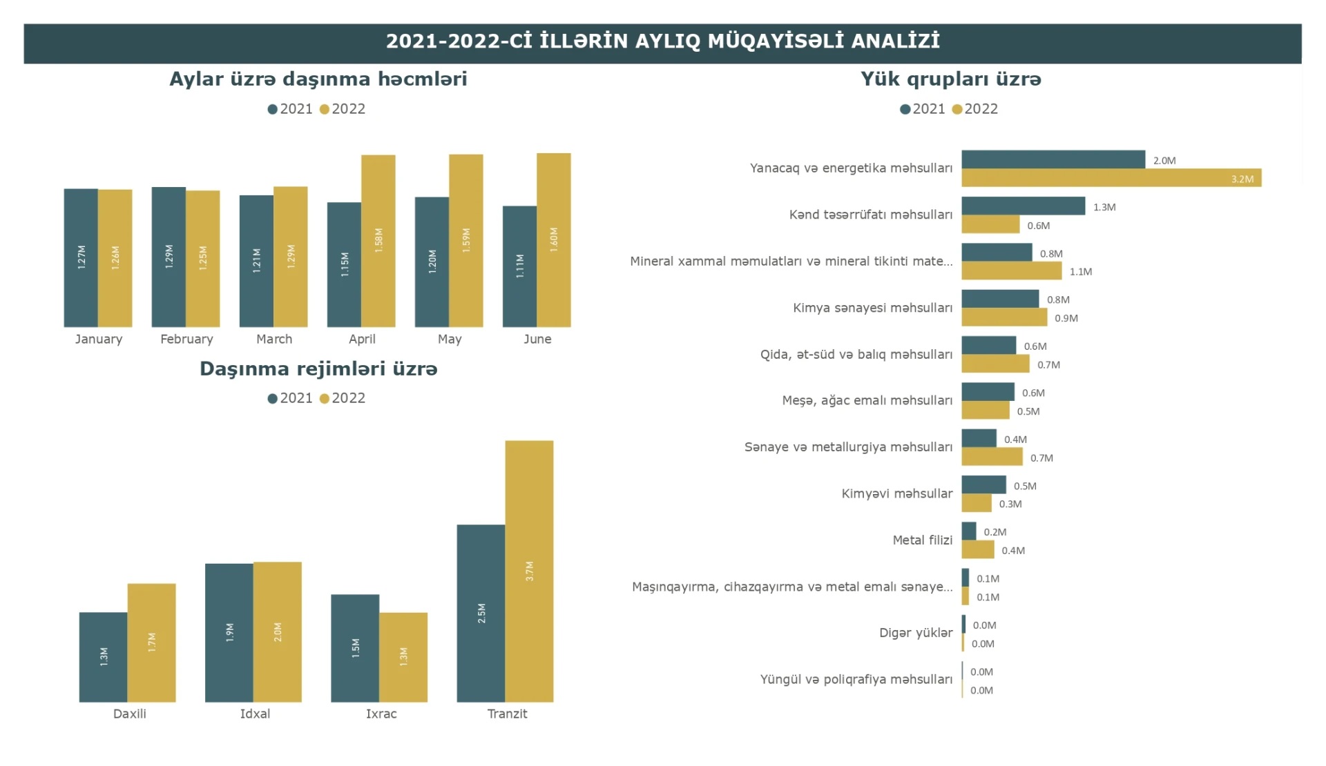 İdxal rejimi üzrə ümumi yükdaşıma həcmində kəskin daşınma fərqləri mövcud olmamasına baxmayaraq yanacaq və energetika məhsullarının daşınmasında 4 dəfədən çox artım müşahidə olunub.