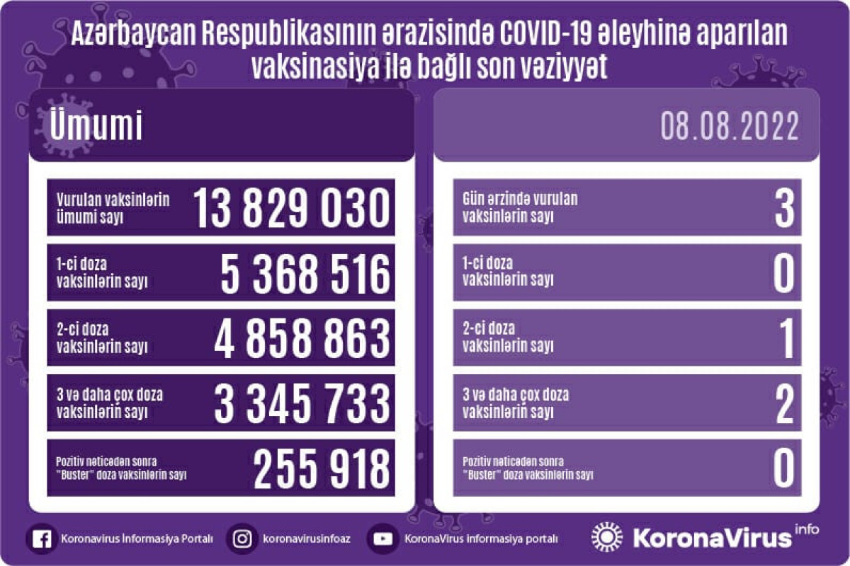 Azərbaycanda son sutkada koronavirus (COVID-19) əleyhinə 3 vaksin vurulub. Bir gündə birinci mərhələ üzrə vaksinasiya olmayıb, ikinci mərhələ üzrə vaksinasiya olunanların sayı 1, üç və daha çox doza vaksin vurduranların sayı 2 nəfər olub. Pozitiv nəticədən sonra buster doza üzrə vaksinasiya olmayıb.