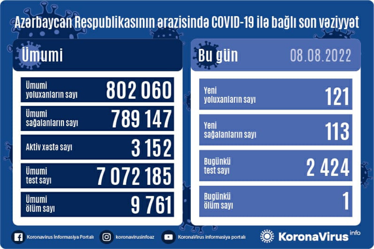 Azərbaycanda son sutkada 121 nəfər koronavirusa yoluxub, 1 nəfər ölübAzərbaycan Respublikasında koronavirus (COVID-19) infeksiyasına 121 yeni yoluxma faktı qeydə alınıb, 113 nəfər müalicə olunaraq sağalıb.