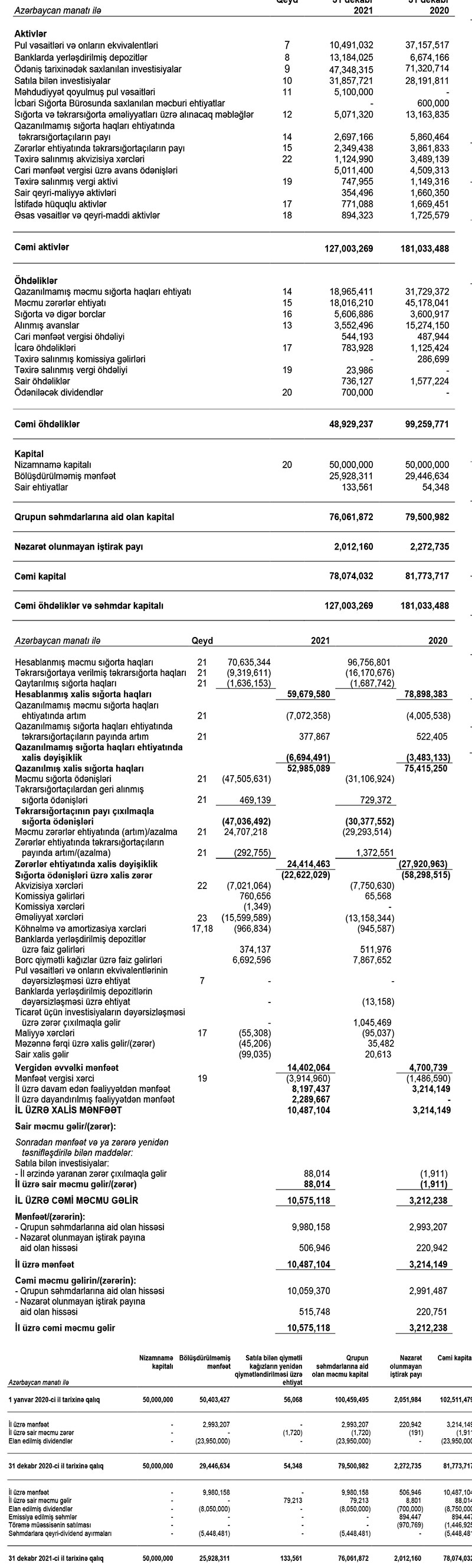 2020-ci ildə 29 milyon 293 min manat artmış məcmu zərərlər ehtiyatı, 2021-ci ildə 24 milyon 707 min manat azalıb.