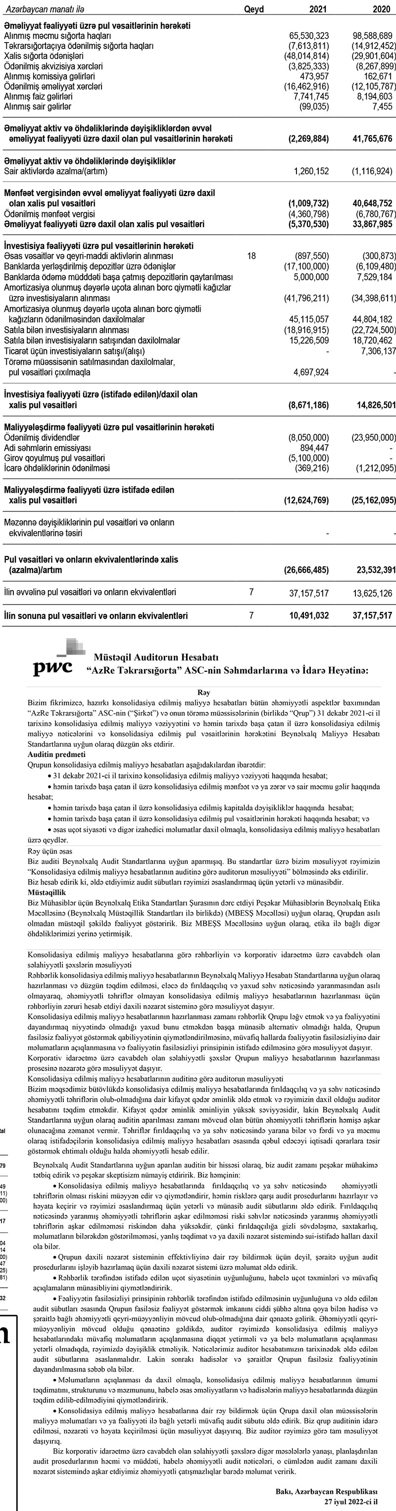 "AzRe Təkrarsığorta" ASC 2021-ci il üzrə konsolidasiya edilmiş maliyyə hesabatlarını mətbuatda dərc etdirib.