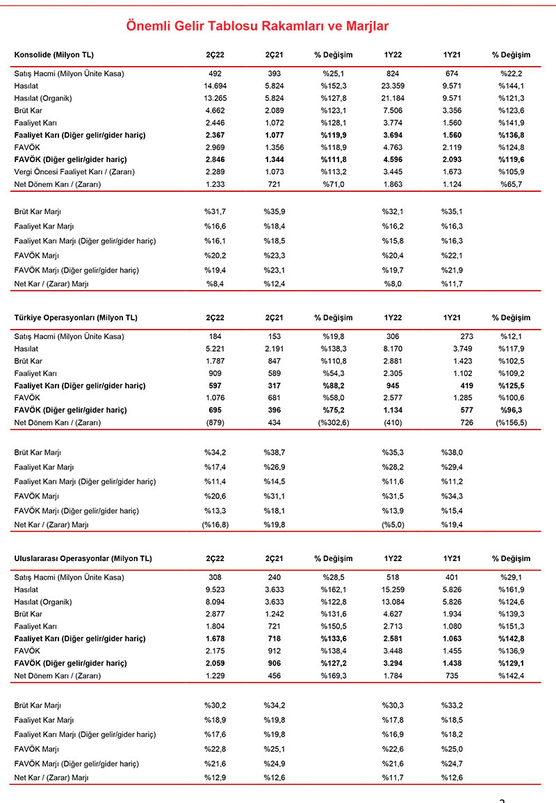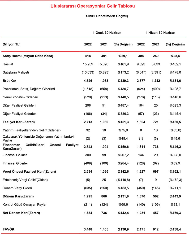 Şirkətin Türkiyədəki əməliyyatlarından ikinci rübdə əldə etdiyi gəlir 138% artaraq 5,2 milyard TL təşkil edib. Beynəlxalq əməliyyatlardan gəlir isə 162,1 faiz artıb.