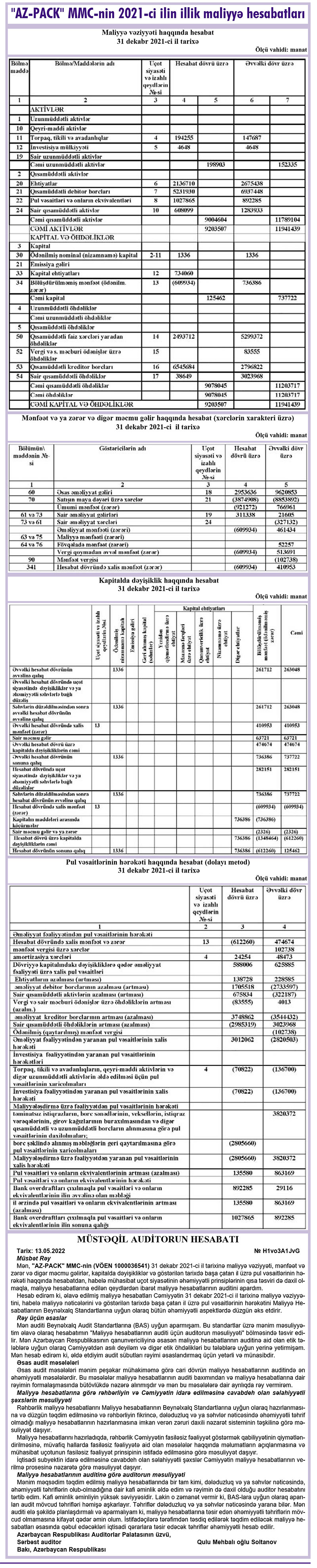 2021-ci ildə "AZ-PACK" MMC-nin cəmi gəlirləri 3 milyon 265 min manat, cəmi xərcləri 3 milyon 875 min manat təşkil edib.