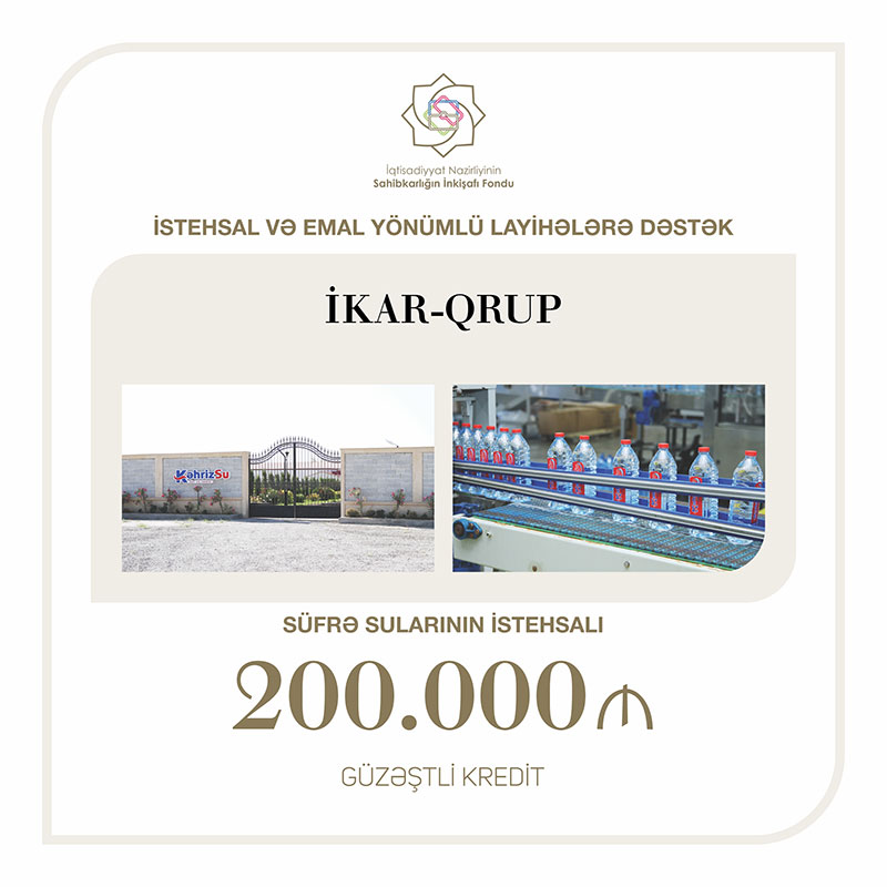 “2021-ci ildə “İKAR-QRUP” MMC süfrə sularının istehsalı məqsədilə Fonddan 200 min manat güzəştli kredit əldə edib”, - deyə nazir bildirib.