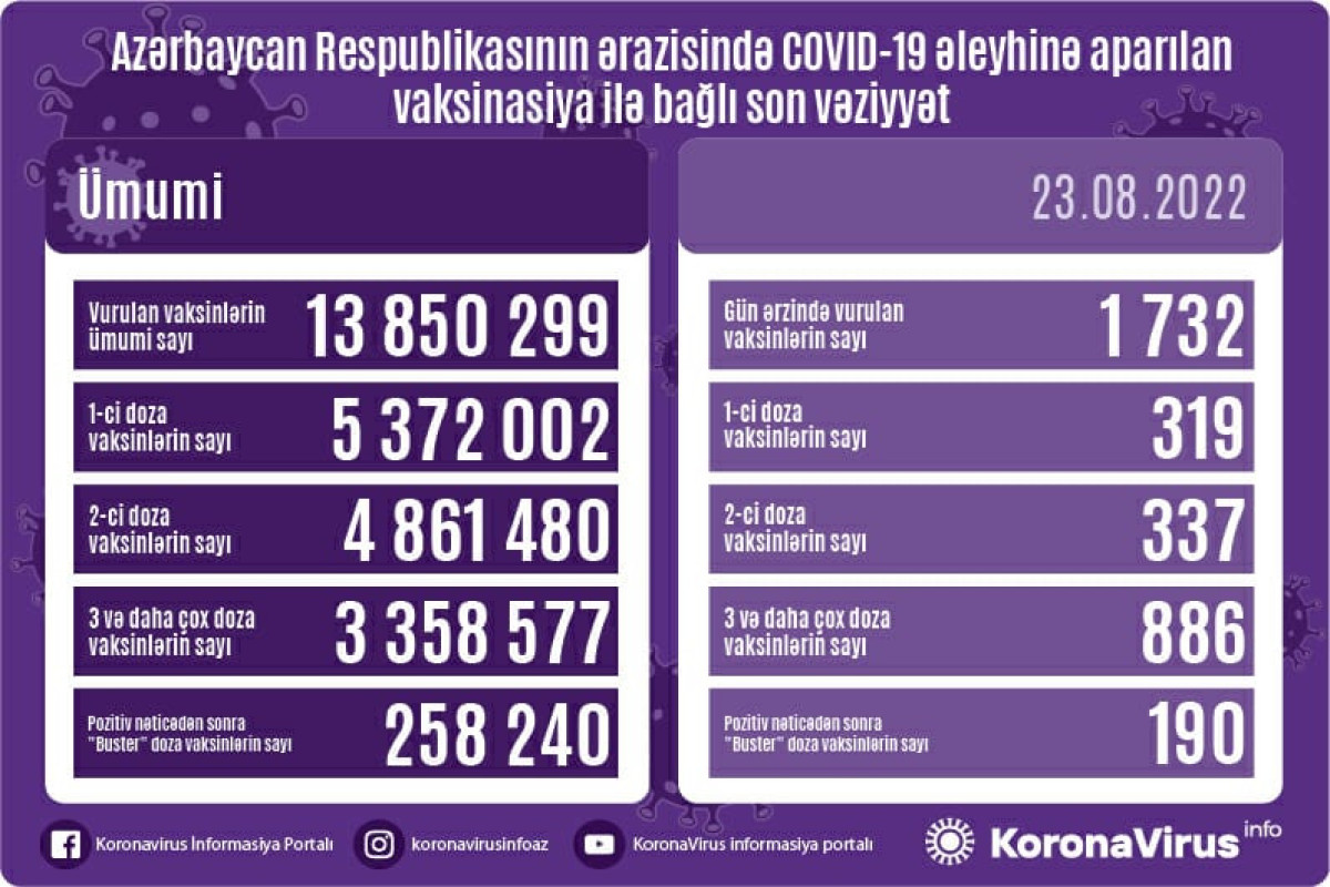 Azərbaycanda son sutkada koronavirus (COVID-19) əleyhinə 1732 vaksin vurulub. Bir gündə birinci mərhələ üzrə vaksinasiya olunanların sayı 319, ikinci mərhələ üzrə vaksinasiya olunanların sayı 337, 3-cü və daha çox doza üzrə vaksinasiya olunanların sayı 886, pozitiv nəticədən sonra buster doza olunanların sayı isə 190 nəfərdir.