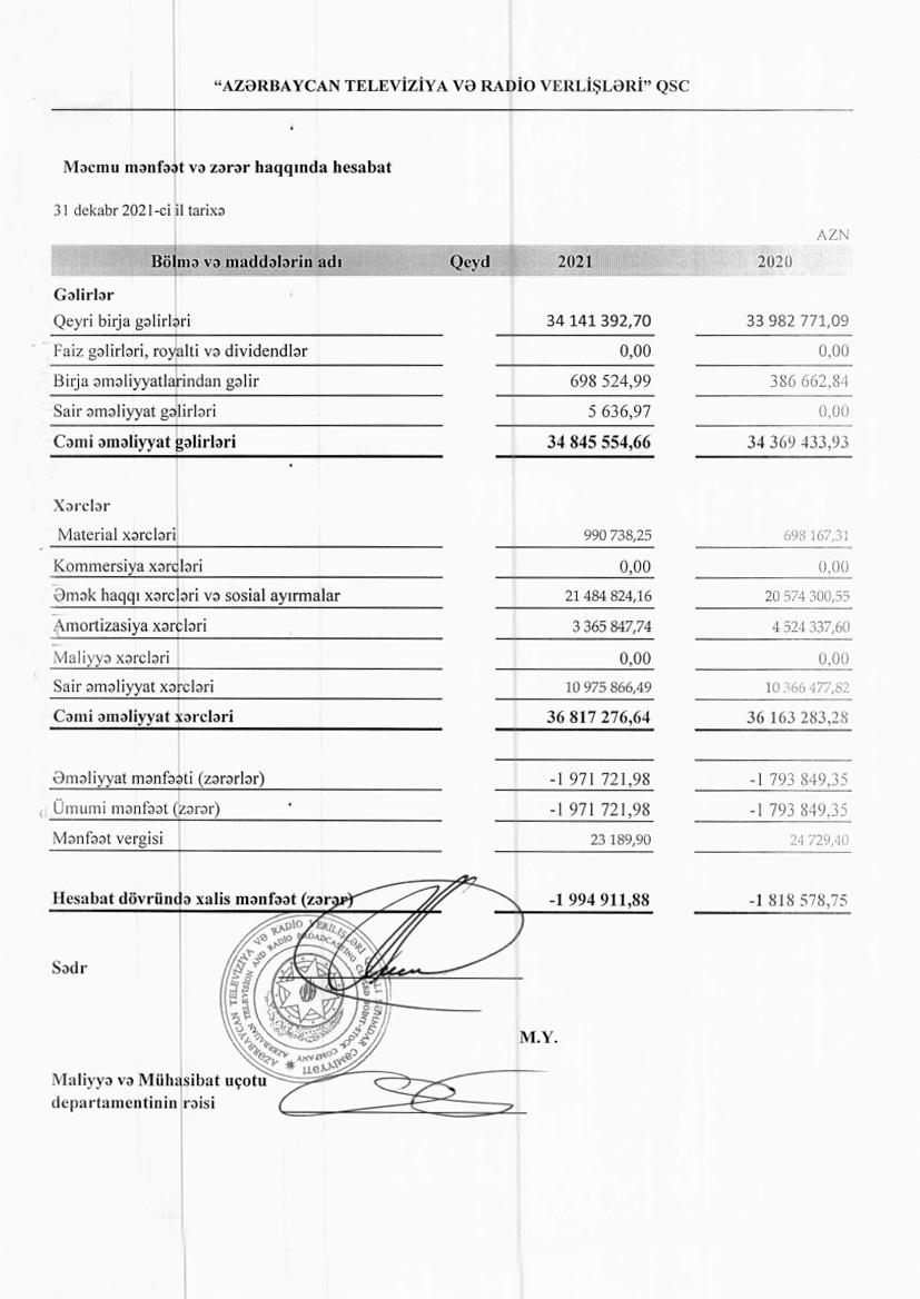 Qurumun maliyyə hesabatına istinadən xəbər verir ki, bu, 2020-ci ilə nisbətən 9,7% çoxdur. AZTV 2020-ci ili 1 milyon 818 min manat xalis zərər ilə bağlamışdı.