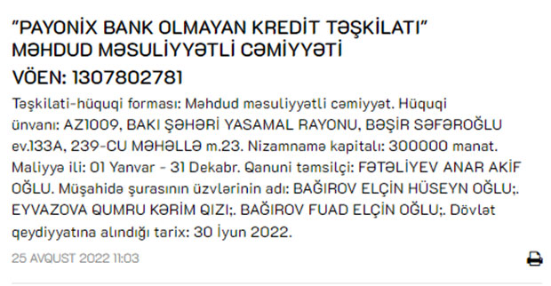 Qeyd edək ki, Payonix Bank Olmayan Kredit Təşkilatı" MMC 30 iyun 2022-ci il tarixində dövlət qeydiyyatına alınıb. 300 min manat nizamnamə kapitalı olan Şirkətin hüquqi ünvanı Bakı şəhəri, Yasamal rayonu, Bəşir Səfəroğlu e. 133A, 239-cu məhəllə m.23-dür.