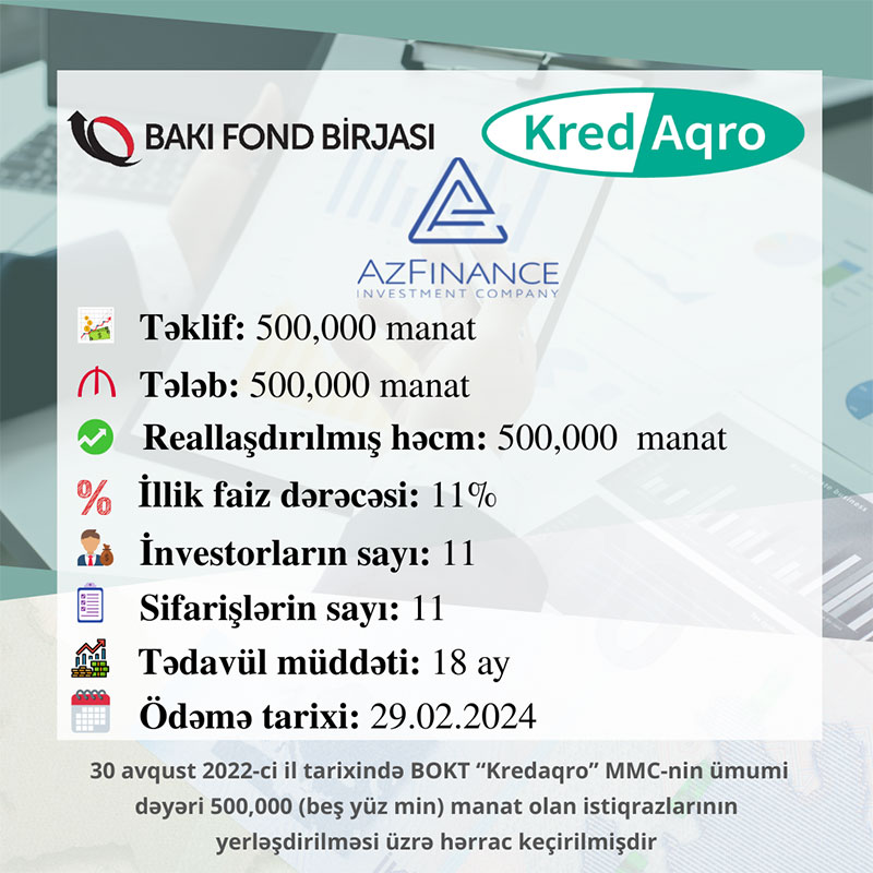 30 avqust 2022-ci il tarixində Bakı Fond Birjasında BOKT “Kredaqro” MMC-nin tədavül müddəti 18 ay olan AZ2002009168 dövlət qeydiyyat nömrəli, 500 000 manat həcmində, faizli, təmin edilmiş sənədsiz, adlı istiqrazlarının yerləşdirilməsi üzrə hərrac yekunlaşıb.