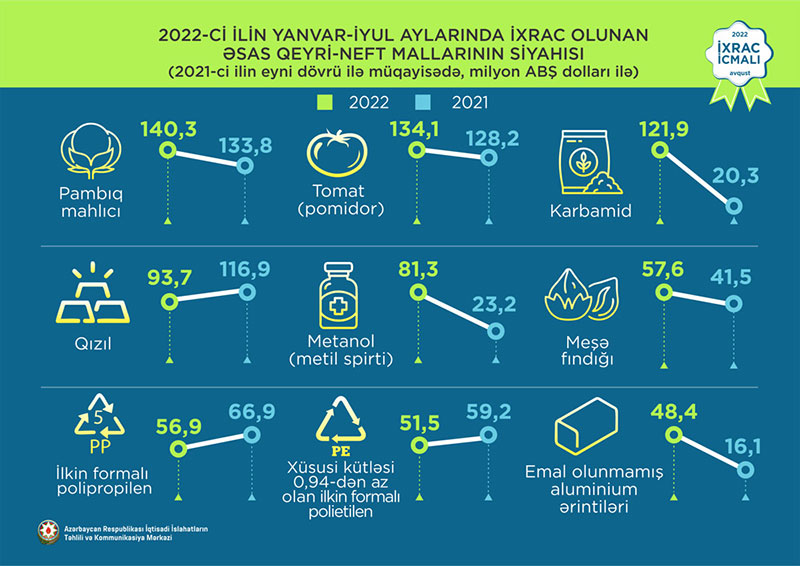 2022-ci ilin yanvar-iyul ayları ərzində ixrac edilən qeyri-neft sektoruna aid malların siyahısında pambıq mahlıcı (140,3 milyon ABŞ dolları) birinci olub. Bu siyahıda tomat (pomidor) (134,1 milyon ABŞ dolları) ikinci, karbamid (121,9 milyon ABŞ dolları) isə üçüncü yerdə qərarlaşıb.